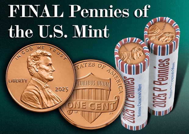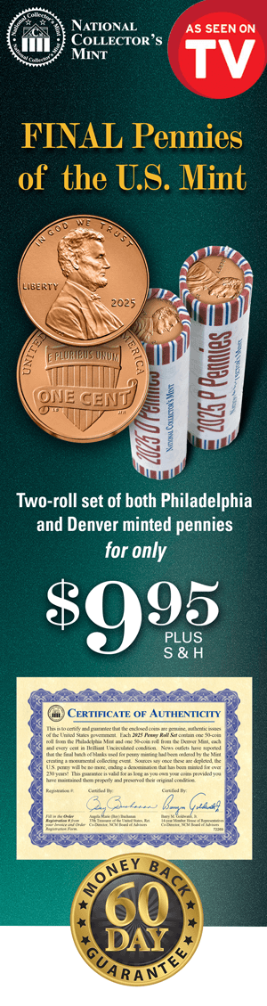 We have 50-coin rolls of beautiful, Brilliant Uncirculated 2025 United States Pennies especially for collectors, because now is the time to load up and stash these beauties away for posterity! You’ll receive a 50-coin roll of Philadelphia Mint pennies and a 50-coin roll of Denver Mint pennies, 100 pennies in all, for just $9.95 plus $3.50 shipping and handling.